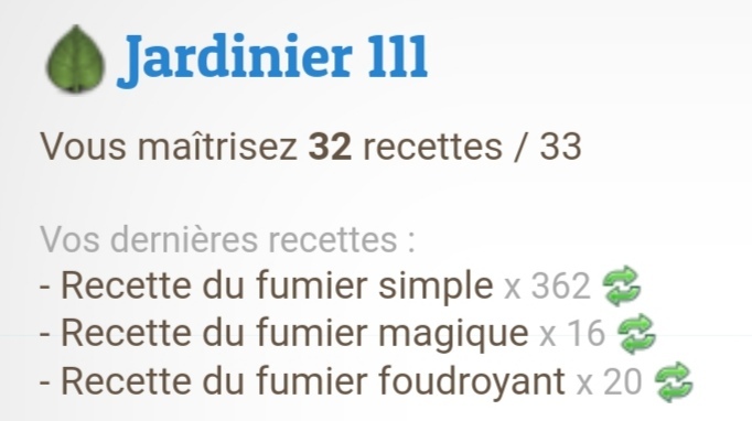 - Rajout de boutons en plus de "fabriquer". Par exemple "fabriquer x10", 'fabriquer x50" et "fabriquer x100". L'avantage de cette dernière proposition est que l'on peut facilement garder ce principe sur la page principale des métiers avec les icones de fleches "x10" , "x50" et "x100".