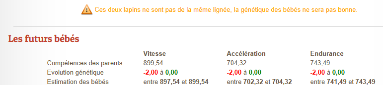 deux lapins issus de la même lignée d’origine peuvent faire progresser la génétique, même s’ils appartiennent à des joueurs différentsdeux lapins issus de lignées différentes, même parfaitement optimisés, verront leur évolution génétique bloquée (entre −2 et 0)